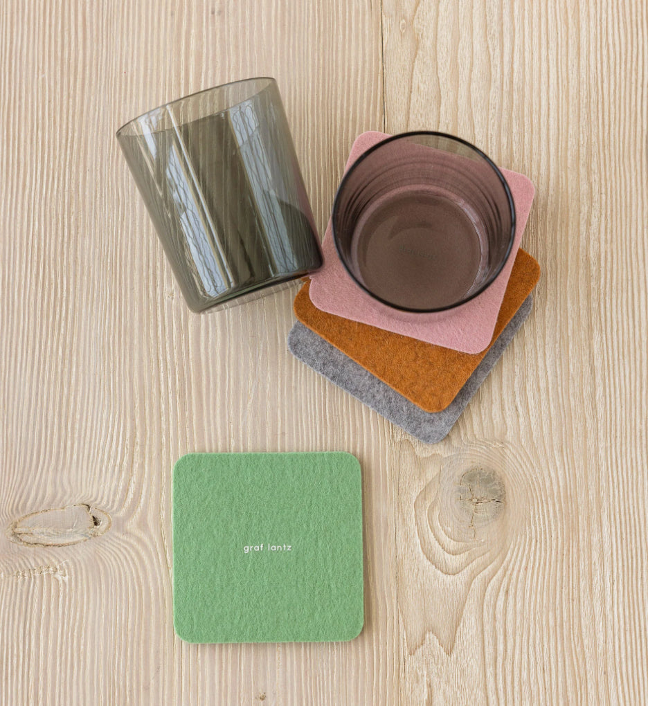 Graf Lantz traditional Bierfilzl ("Beer Felt") are the highest quality German merino wool felt coasters on the market today. Their clean and minimal execution offers an unexpected textural and refined modern heritage element to any home decor. Set includes 4 hand-cut heavy duty 5mm thick wool felt coasters to provide extra surface protection.