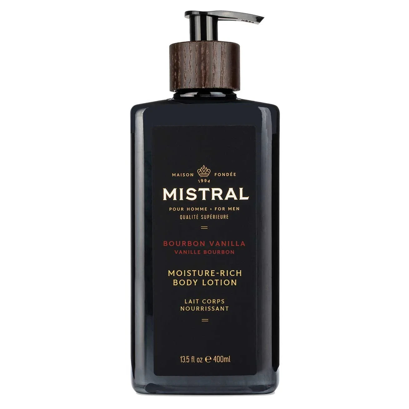 Mistal Body Lotion is fast-absorbing, featuring powerful olive squalene and shea oil that effectively nourish your skin. Soothes dry spots, hydrates, improves elasticity, and leaves a rich masculine scent.