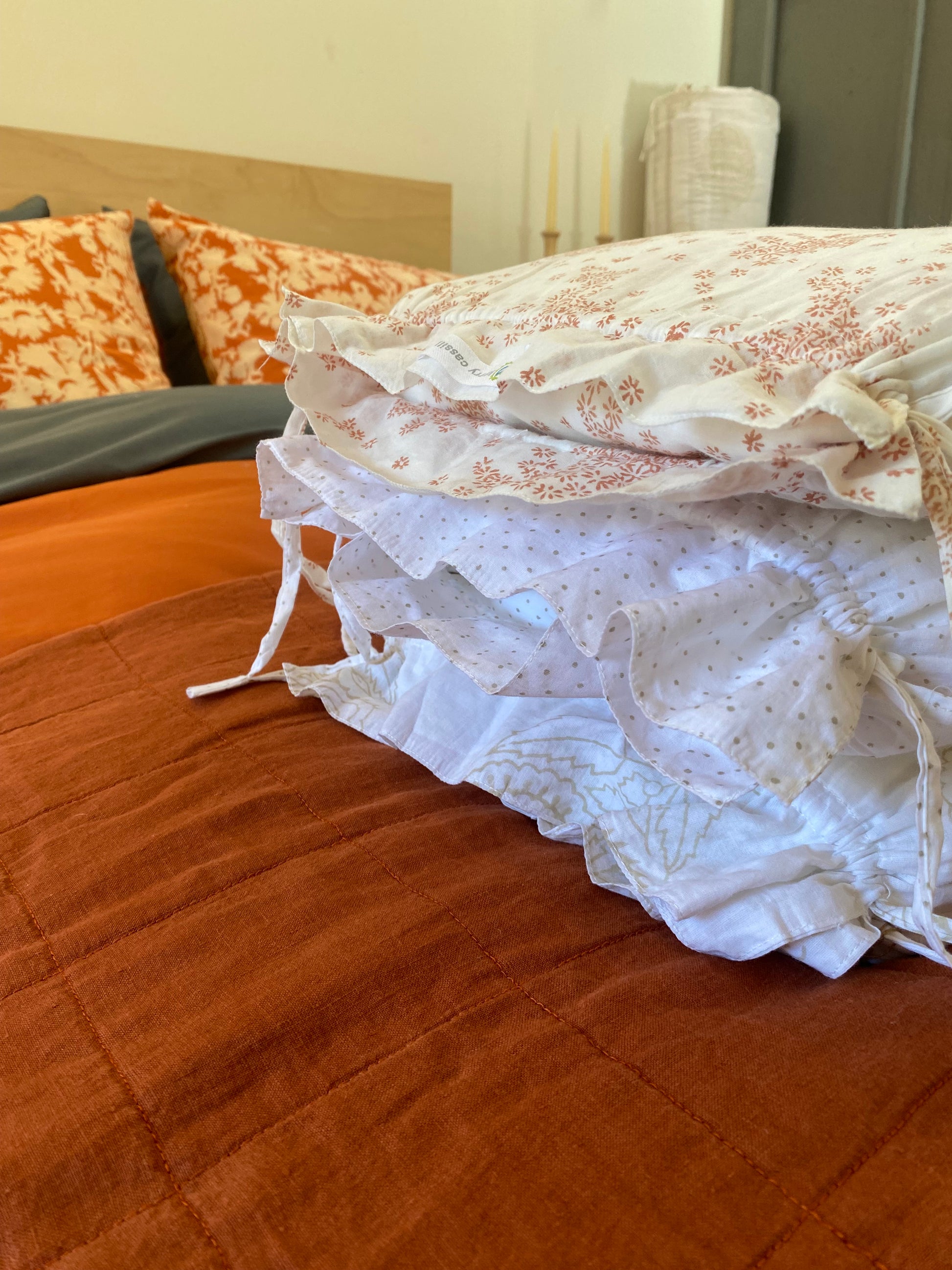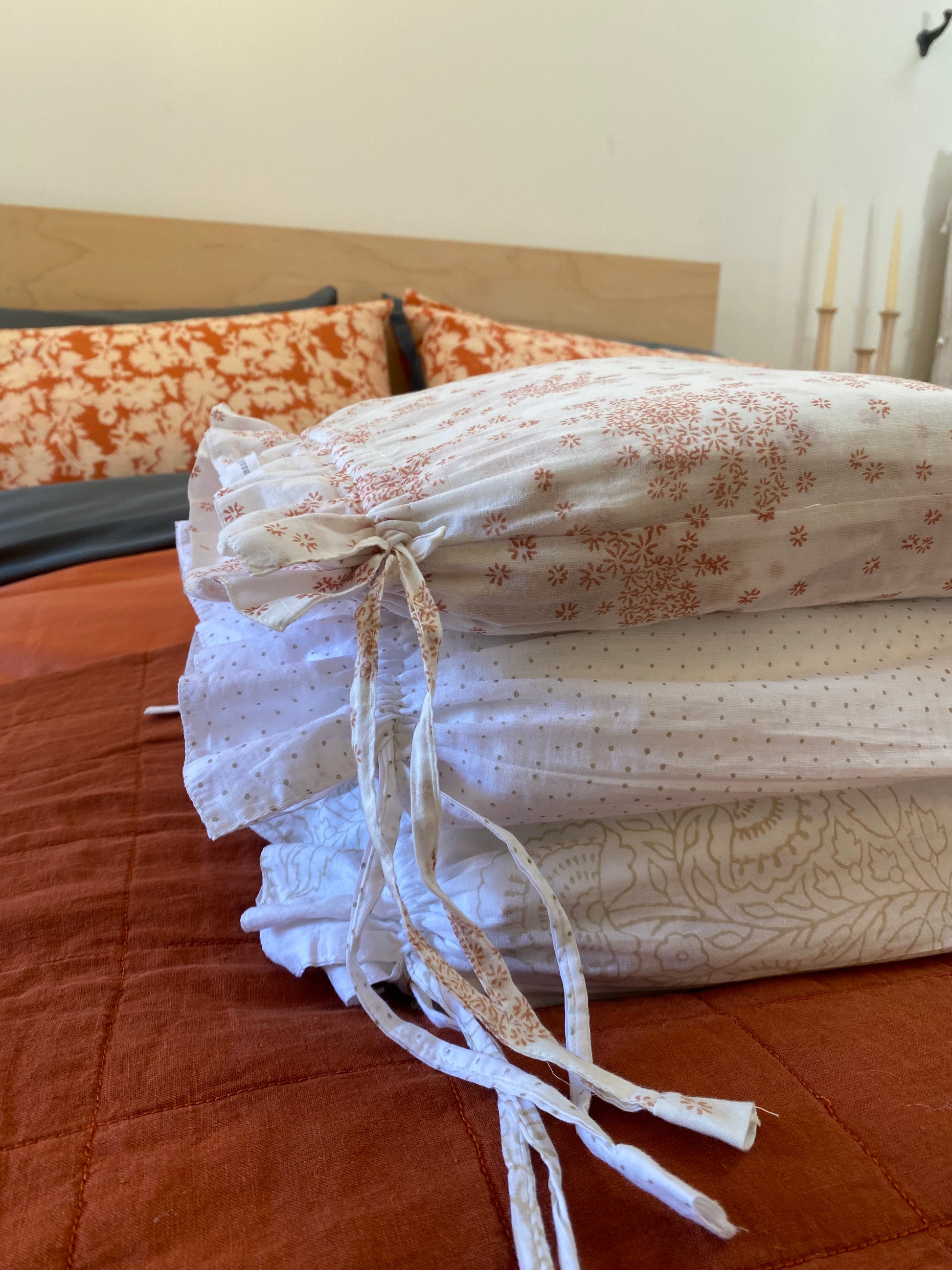 Kerry Cassill's duvet covers include two layers of super-soft Indian cotton voile and shell button closures. Pair with mix and matched pillowcases for a perfectly imperfect look.