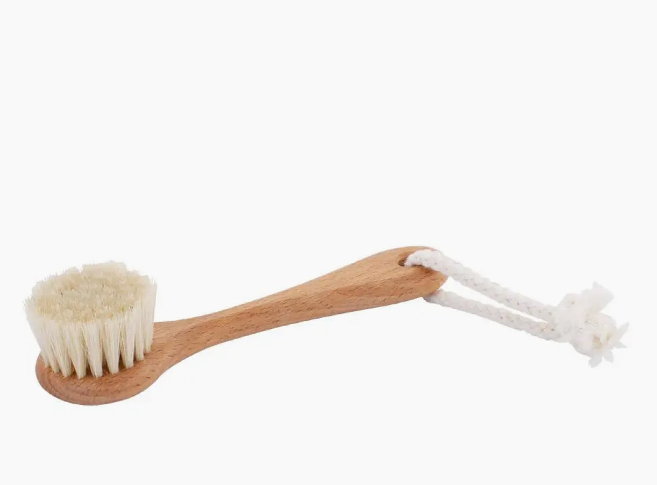 This Redecker face brush is made of soft goat hair bristle, an oiled beechwood handle with a cotton strap.