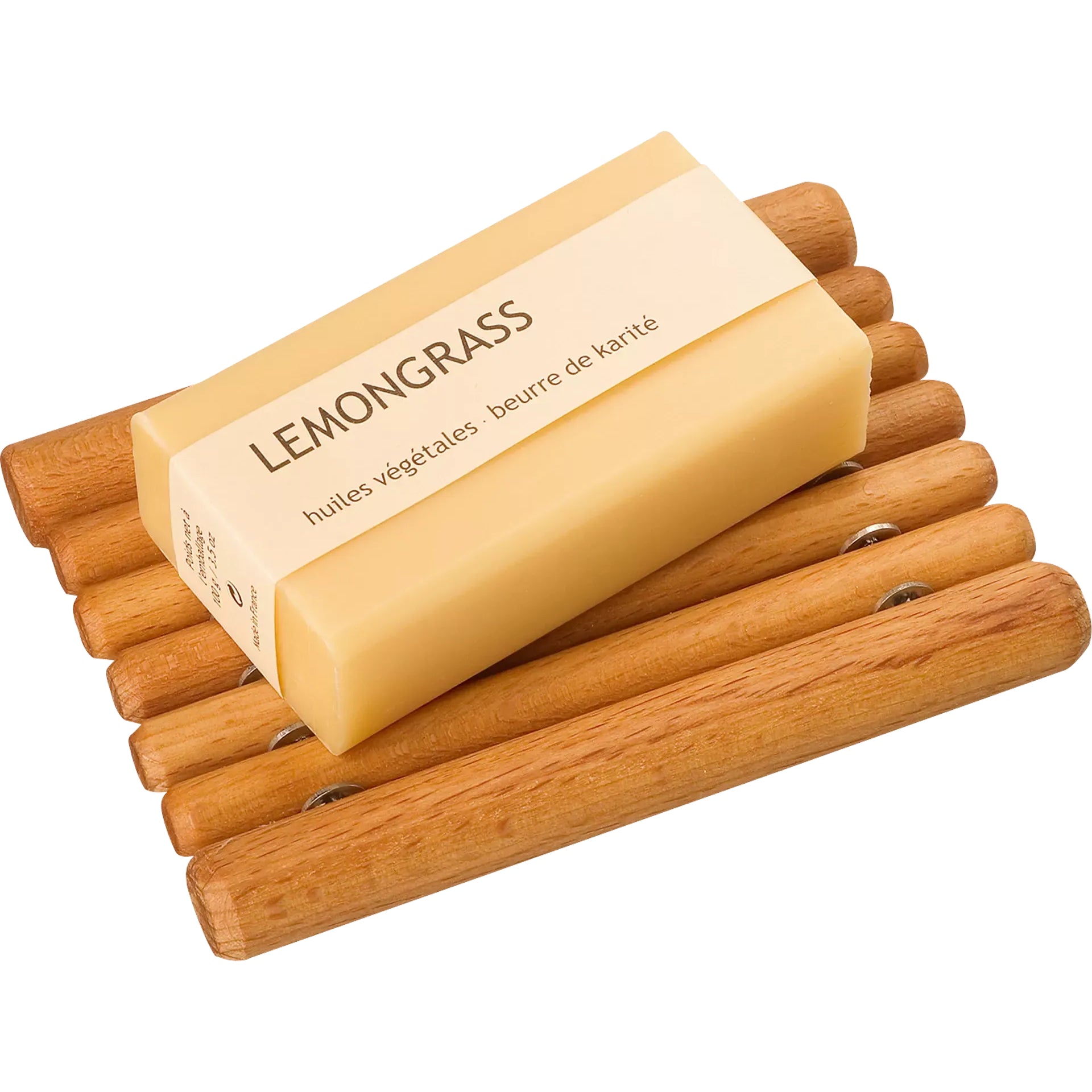 Soap dish made of round, oiled beechwood rods, with stainless steel wire and stainless steel discs as spacers.